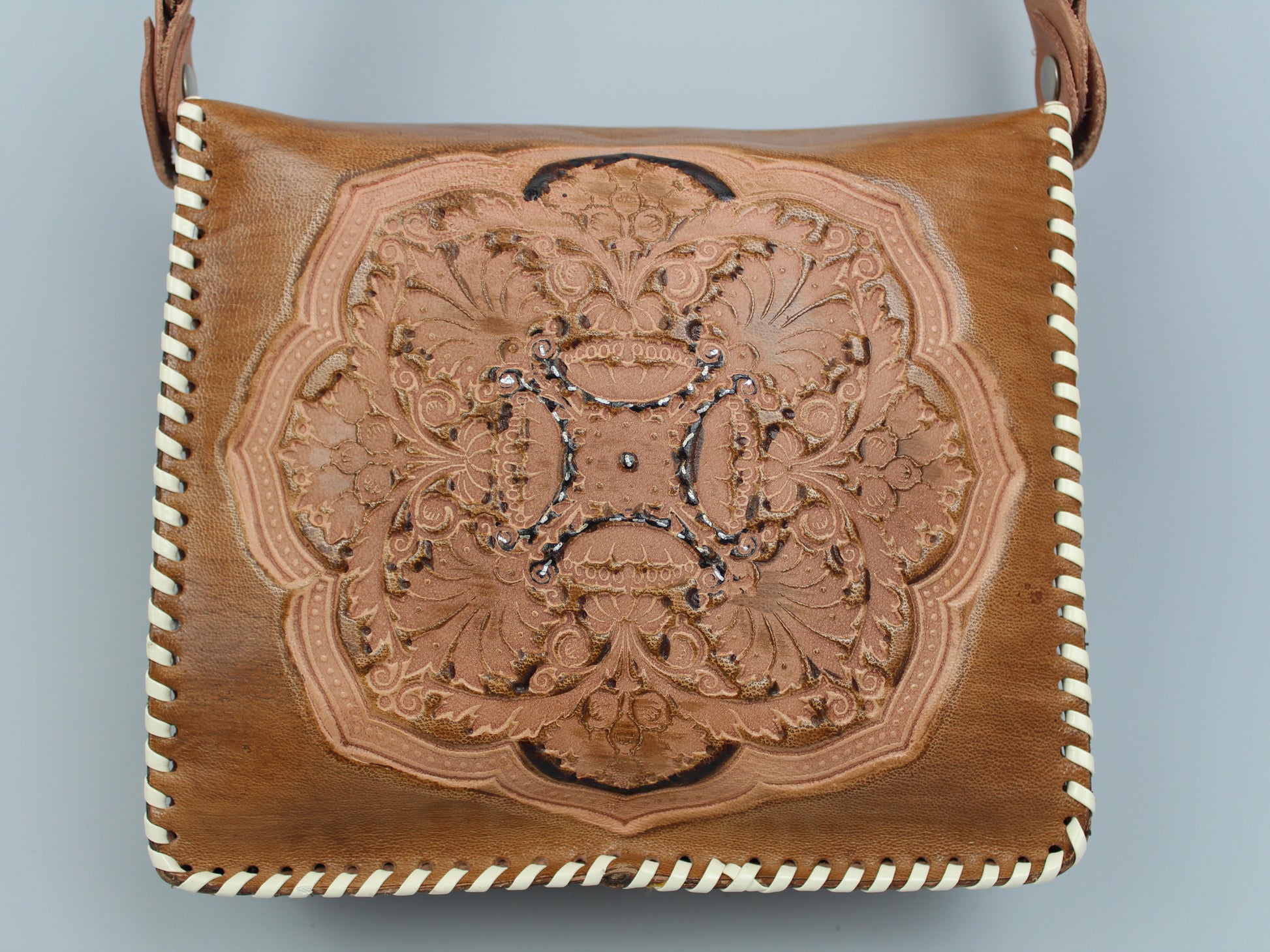 Beautifully handmade Leather Shoulder bag with flower detail, bold cream stitches. .