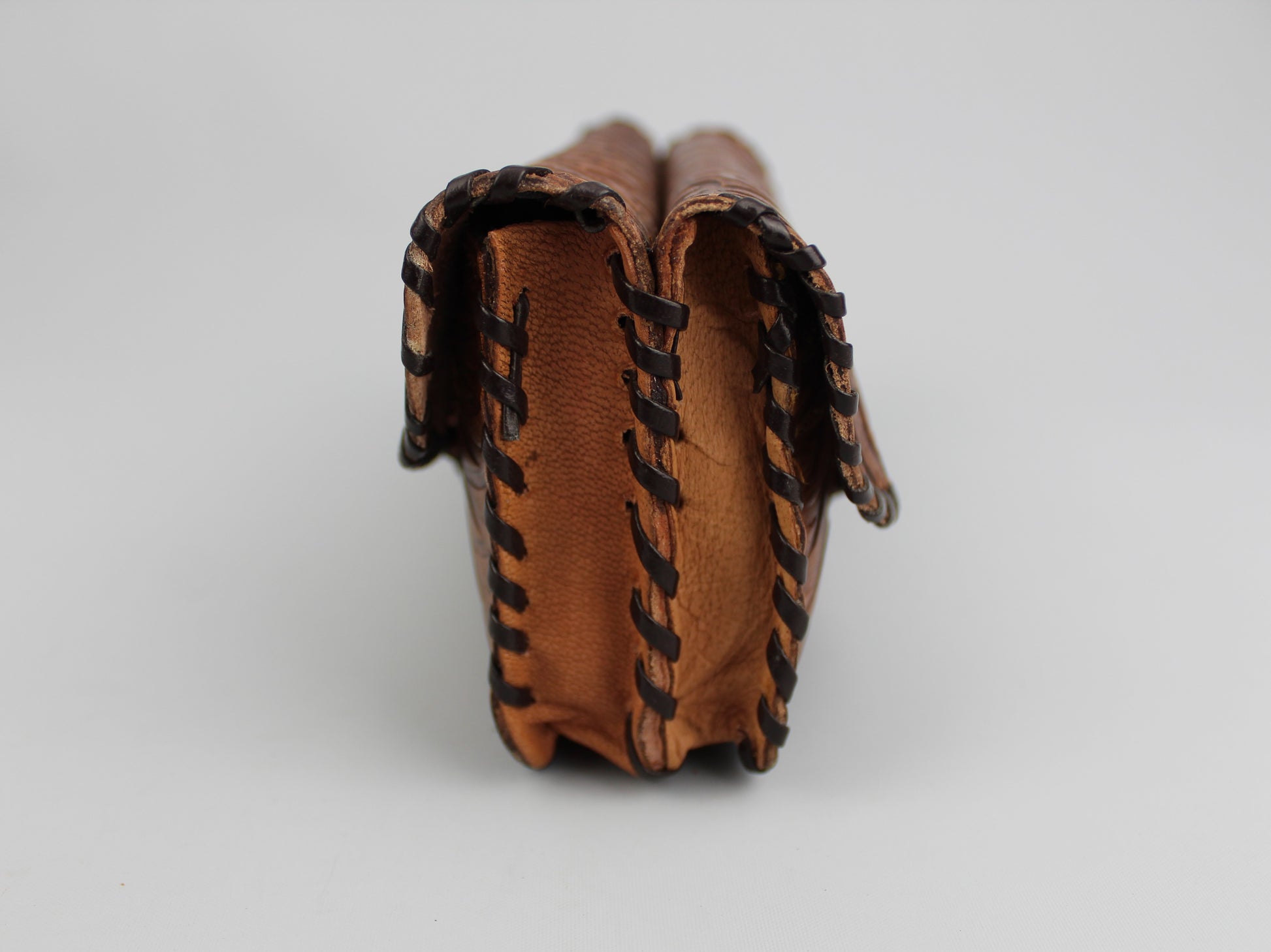 Beautifully Handmade from leather. Two main compartments both decent sizes and with magnetic clasp on each side. Two zipped pockets one on each side of each compartment.